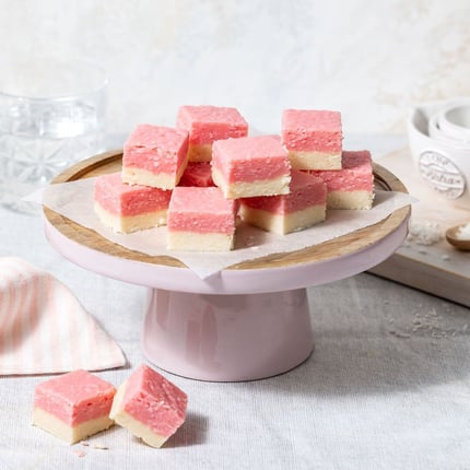 Remove from the heat and stir in the vanilla essence. Carefully transfer half of the mixture into a heatproof bowl. Tint pink with food colouring, then stir in half the coconut. Stir remaining coconut into the mixture left in the saucepan. Cool for 2 minutes, then beat the white layer until the mixture thickens. Pour into prepared tin and spread out into an even layer. Freeze for 5 minutes.