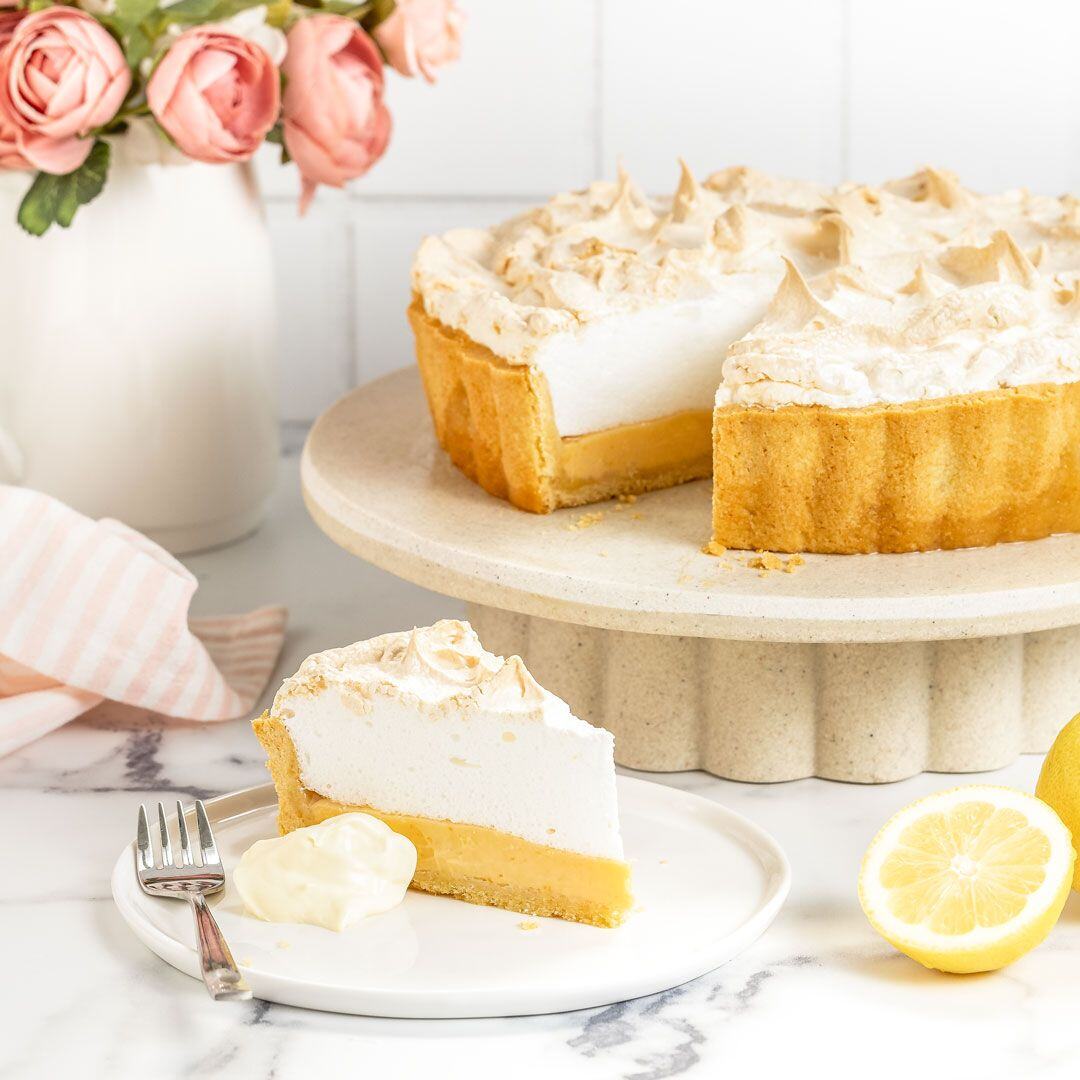 Pipe or pile the meringue onto the hot filling. Bake for 15 minutes, until meringue is firm and crisp. Cool completely in the tin (can be refrigerated after cooling if desired).