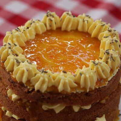 Spread one layer of orange cream cheese mousse on top of the sponge and spread some orange marmalade on top of the cream cheese mousse.
