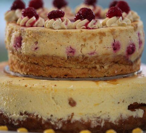 Garnish with raspberry curd, lemon curd and fresh berries to serve.