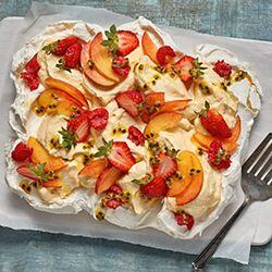 For serving, fold mango puree through the whipped cream and dollop onto pavlova. Top with sliced peaches, strawberries, raspberries, passionfruit and mint.