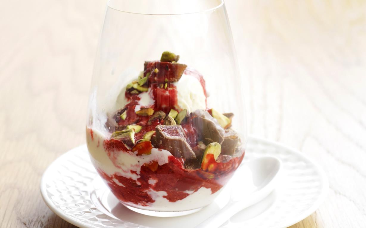 Layer scoops of ice cream with the raspberry puree, Turkish delight and pistachios in serving glasses. Serve immediately.